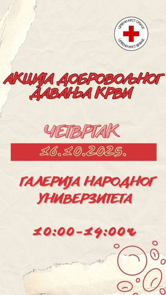 Crveni krst Vranje poziva sve građane dobre volje da se pridruže akciji dobrovoljnog davanja krvi, koja će biti održana u četvrtak, 16. oktobra, od 10 do 14 časova u Galeriji Narodnog univerziteta (ulaz kod Biblioteke).