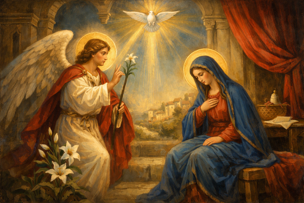 U tišini malog nazaretskog doma, Marija je sedela zamišljena, uronjena u molitvu. Dan je bio vedar, a kroz prozor su se čuli glasovi ptica koje su se vraćale iz dalekih krajeva. Sve je izgledalo obično, sve dok se prostor nije ispunio neobičnom svetlošću.
