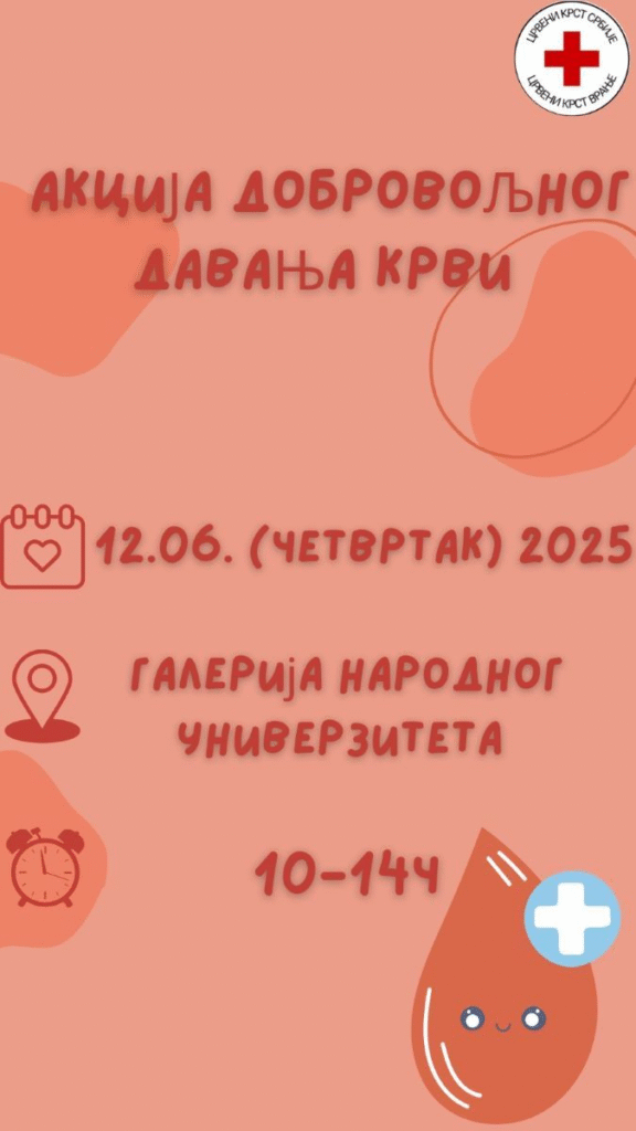 Crveni krst Vranje organizuje Akcija dobrovoljnog davanja krvi, koju organizuje Crvni krst Vranje, biće sprovedena u četvrtak, 12. juna od 10.00 do 14.00 časova u sali Galerije Narodnog univerziteta u Vranju (ulaz kod Biblioteke).