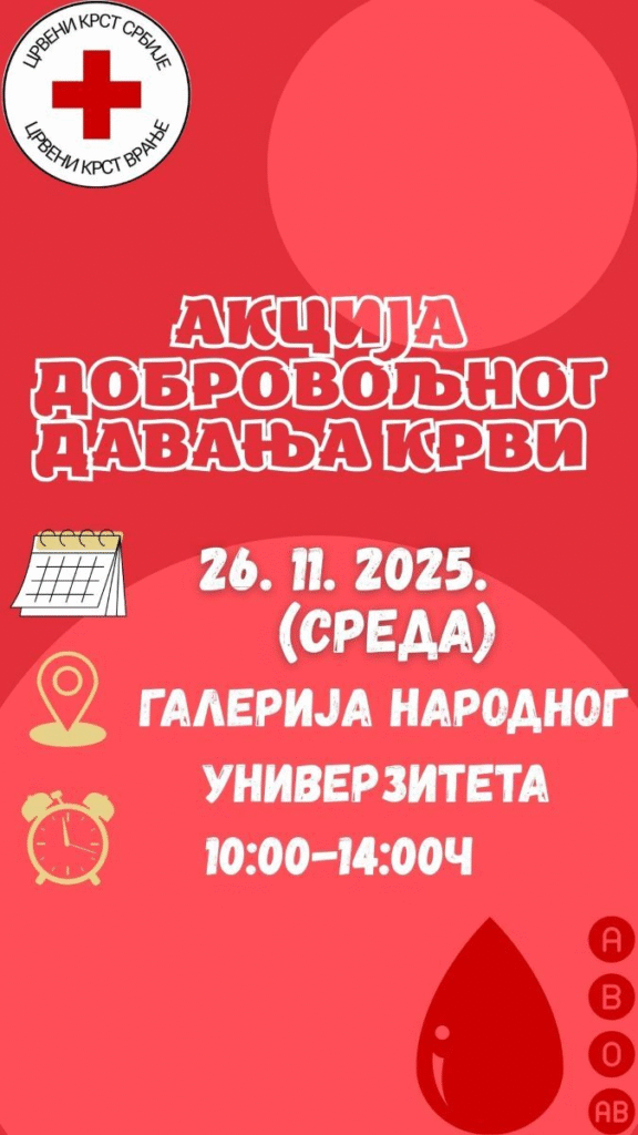 Crveni krst Vranje, u Galeriji Narodnog univerziteta u Vranju, organizuje akciju dobrovoljnog davanja krvi u sredu 26. novembra od 10 do 14 časova.