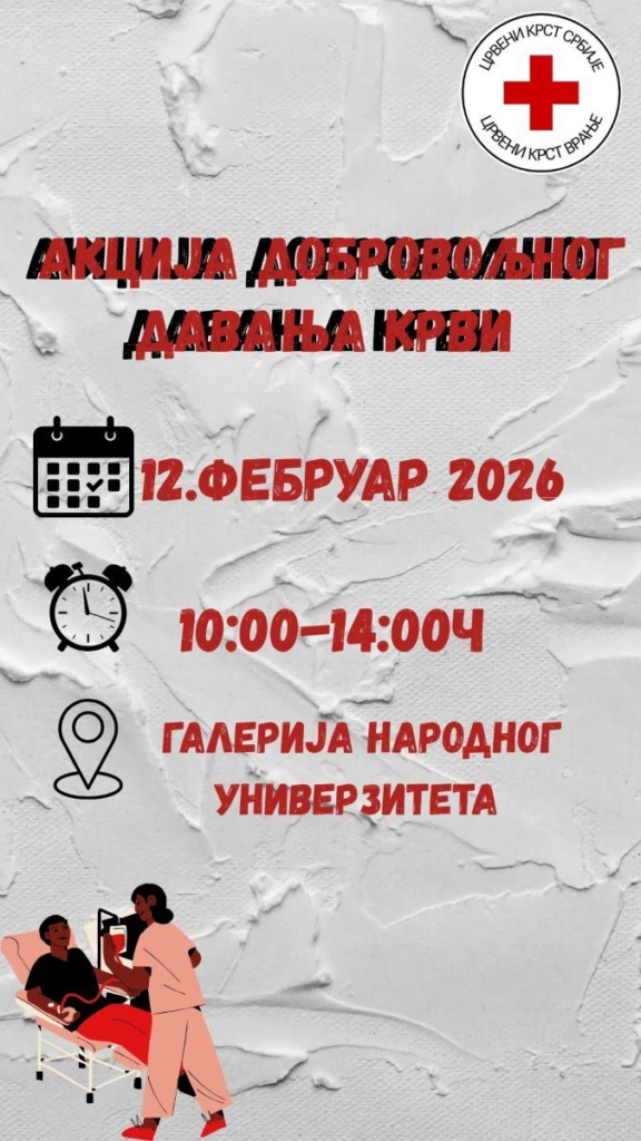 U četvrtak, 12. februara od 10.00 do 14.00 časova u Galeriji Narodnog univerziteta u Vranju biće organizovana nova akcija dobrovoljnog davanja krvi zahvaljujući angažmanu Crvenog krsta Vranje.